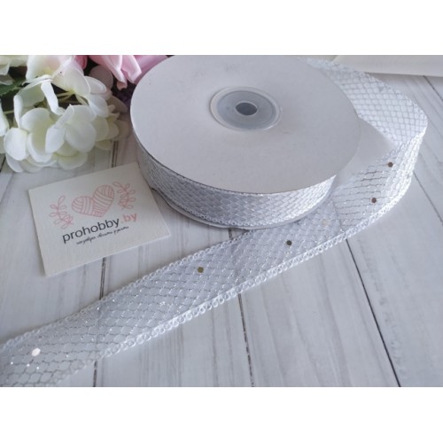 Лента с сеточкой и блестками, 25 мм, цвет белый