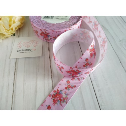 Лента репсовая 25 мм "Букеты цветов на розовом"