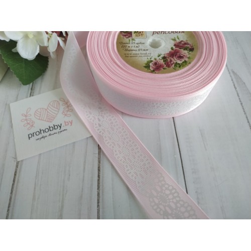 Лента репсовая 25 мм "Кружево на светло-розовом"