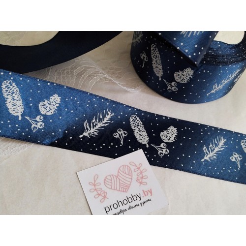 Лента атласная "Шишки и веточки", 40 мм, цвет тёмно-синий/белый №38