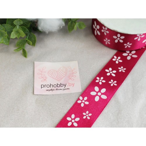 Лента атласная 25 мм "Цветы", цвет малиновый/белый