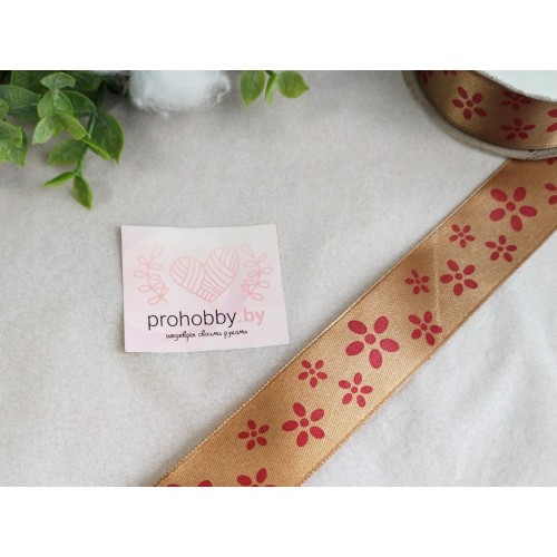 Лента атласная 25 мм "Цветы", цвет светло-коричневый/красный