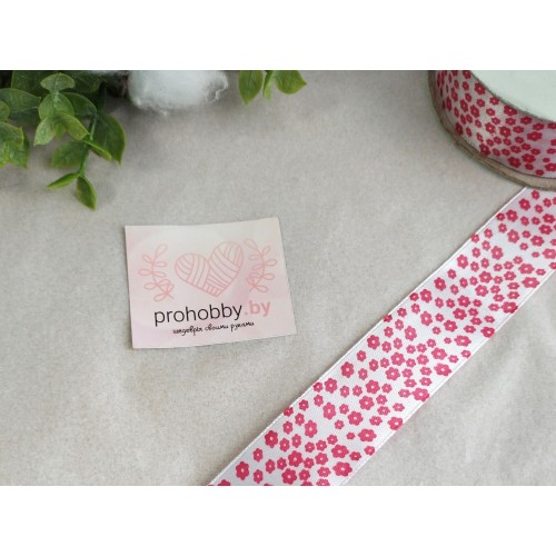 Лента атласная 25 мм "Цветочки", цвет белый/розовый