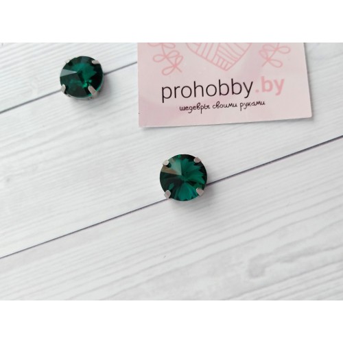 Стразы в цапах пришивные, круг 12 мм, цвет изумруд в серебре